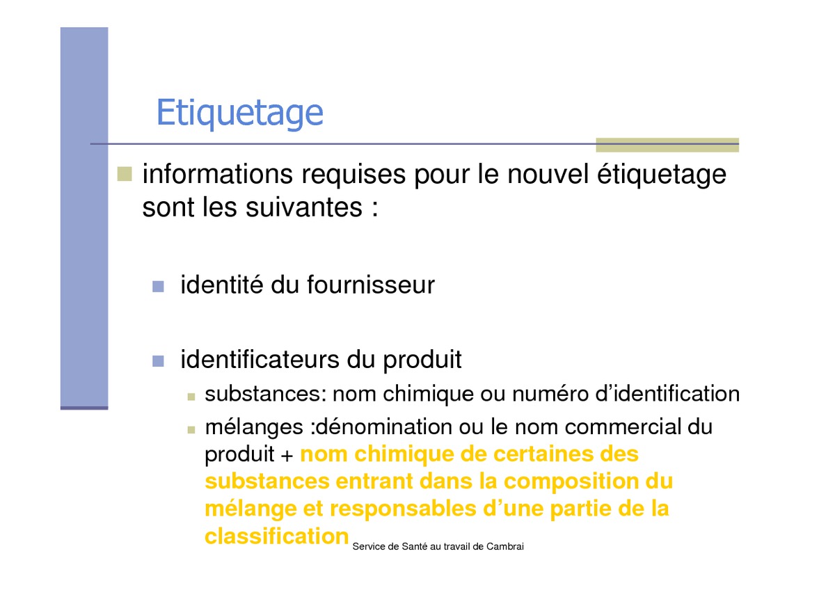 Quels sont les changements liés à la nouvelle réglementation sur l’étiquetage des produits ? Délai ? Quels seront les nouveaux repères pour identifier les produits CMR ? Phrases de risque, classes de danger, limites de concentration, pictogrammes,...